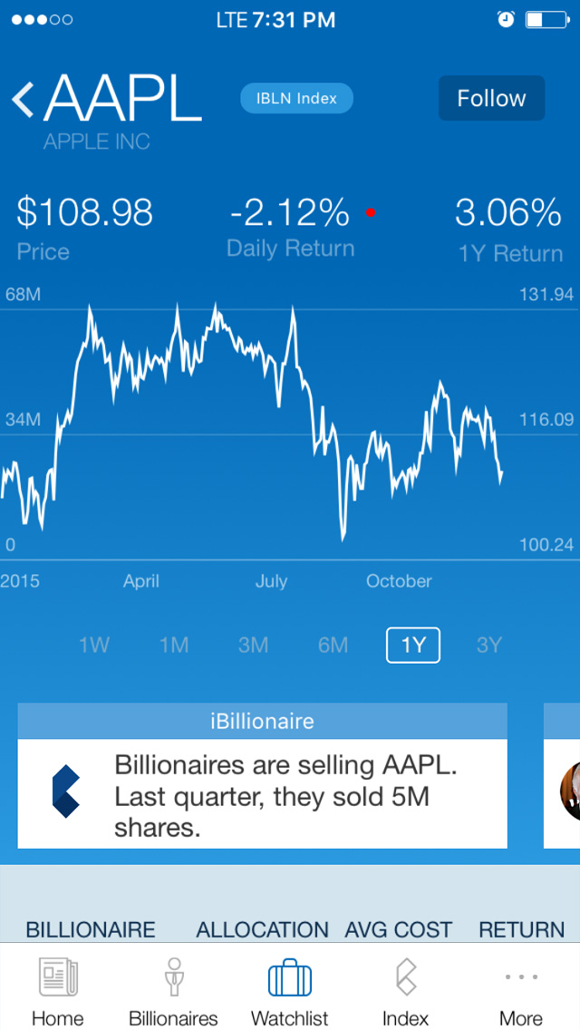 iBillionaire provides access to the investment data and strategies of the world’s most successful, self-made billionaires. Their mission is to help people become a better investor by following and learning from Wall Street’s best.